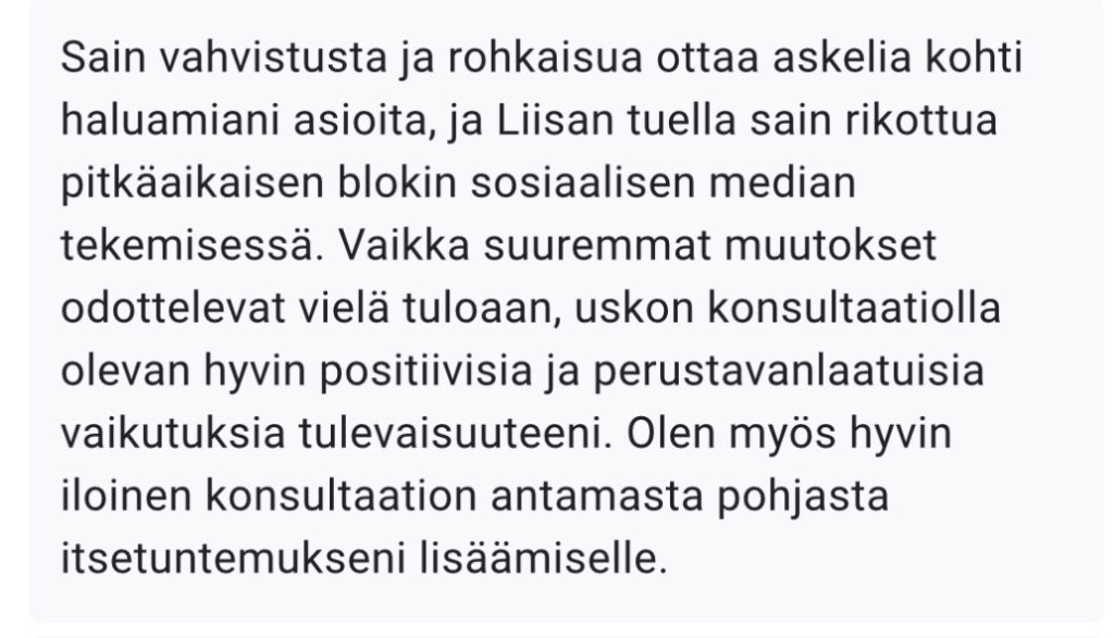 💫 alkukartoitus + 1.5 h ja 1h konsultaatiot + tehtävät ja tapaamisten välinen tuki + 45 min jälkitapaaminen