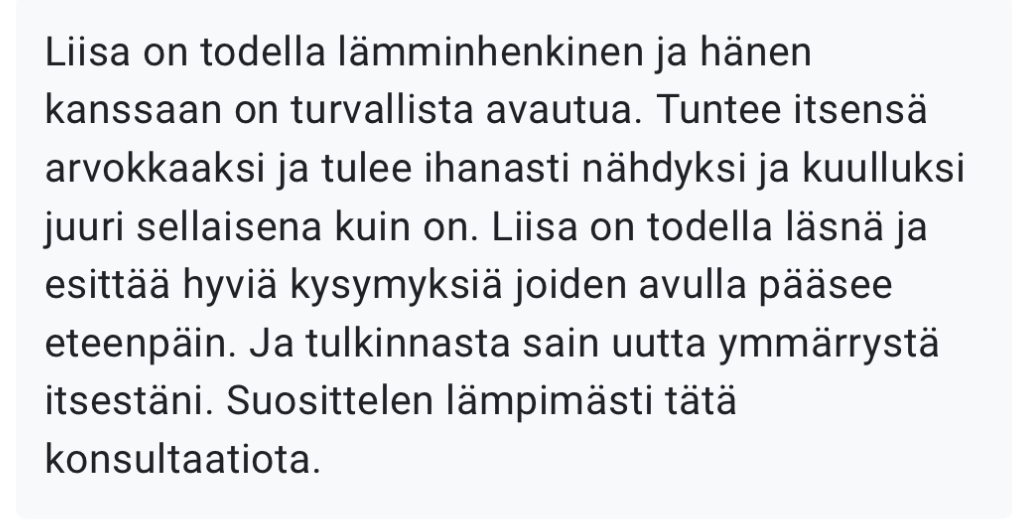 ✨ Saat selkeyttä, varmuutta ja inspiraatiota lähteä toteuttamaan itseäsi. Saat suuntaa jotta voit elää mielekkäästi.- ei niin, että odotat lomaa.