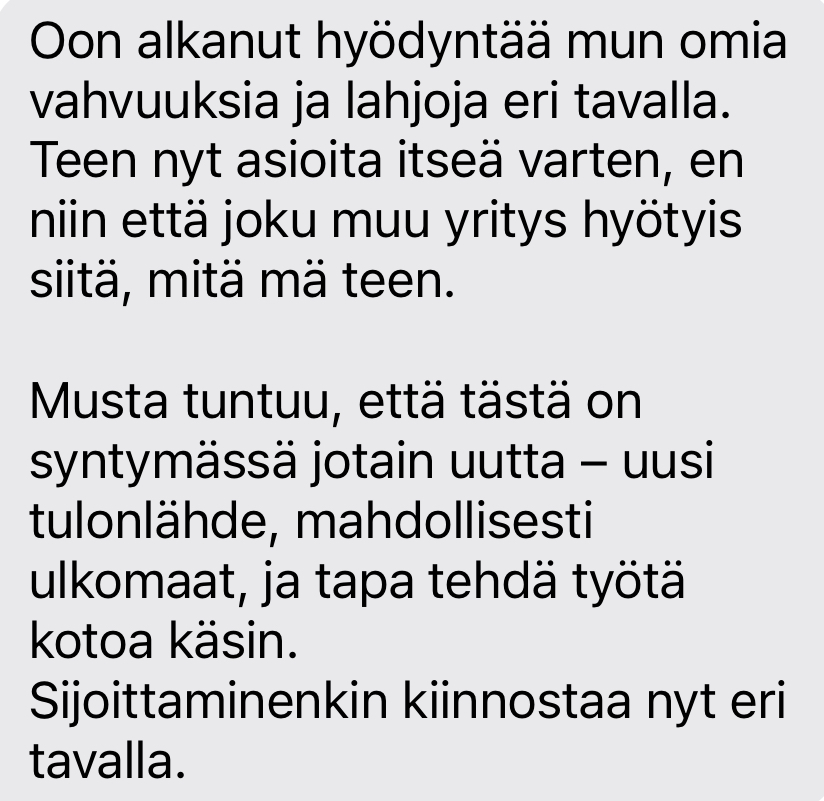 ✨ Teet töitä, joka ei tunnu enää omalta. Ehkä se oli joskus sun menneisyyden unelma, mutta nyt huomaat syvällä sisimmässäsi, että se ei ole enää se, mitä haluat. Mietit, että mitä sitten ja olet edes epävarma mikä sua kiinnostaa. Jatkat tuttuun tapaan, koska pelottaa – perhe on elätettävänä, maksut ja lainat painaa ja ajatus suunnan muuttamisesta tuntuu liian isolta. Mut silti tiedät ettei näin voi jatkua…